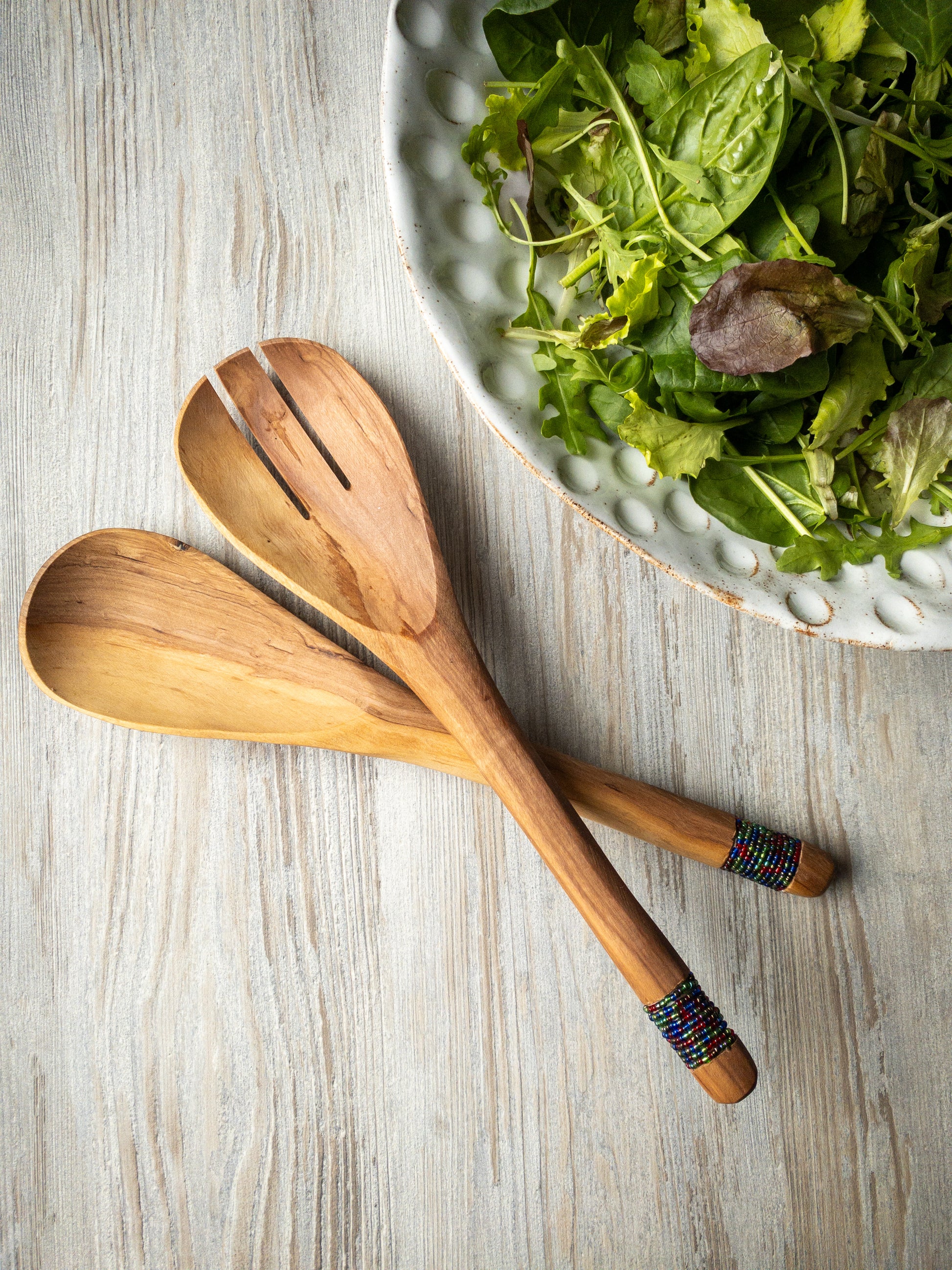 Beautifully crafted with skilful hands, these blue beaded salad servers are a delightful way to present your healthy cuisine. With blue beads delicately arranged on handles of rich, exquisite Ugandan wood, these graceful utensils will bring an air of sophistication to your meal. Experience the refined beauty and craftsmanship of these unique salad servers.