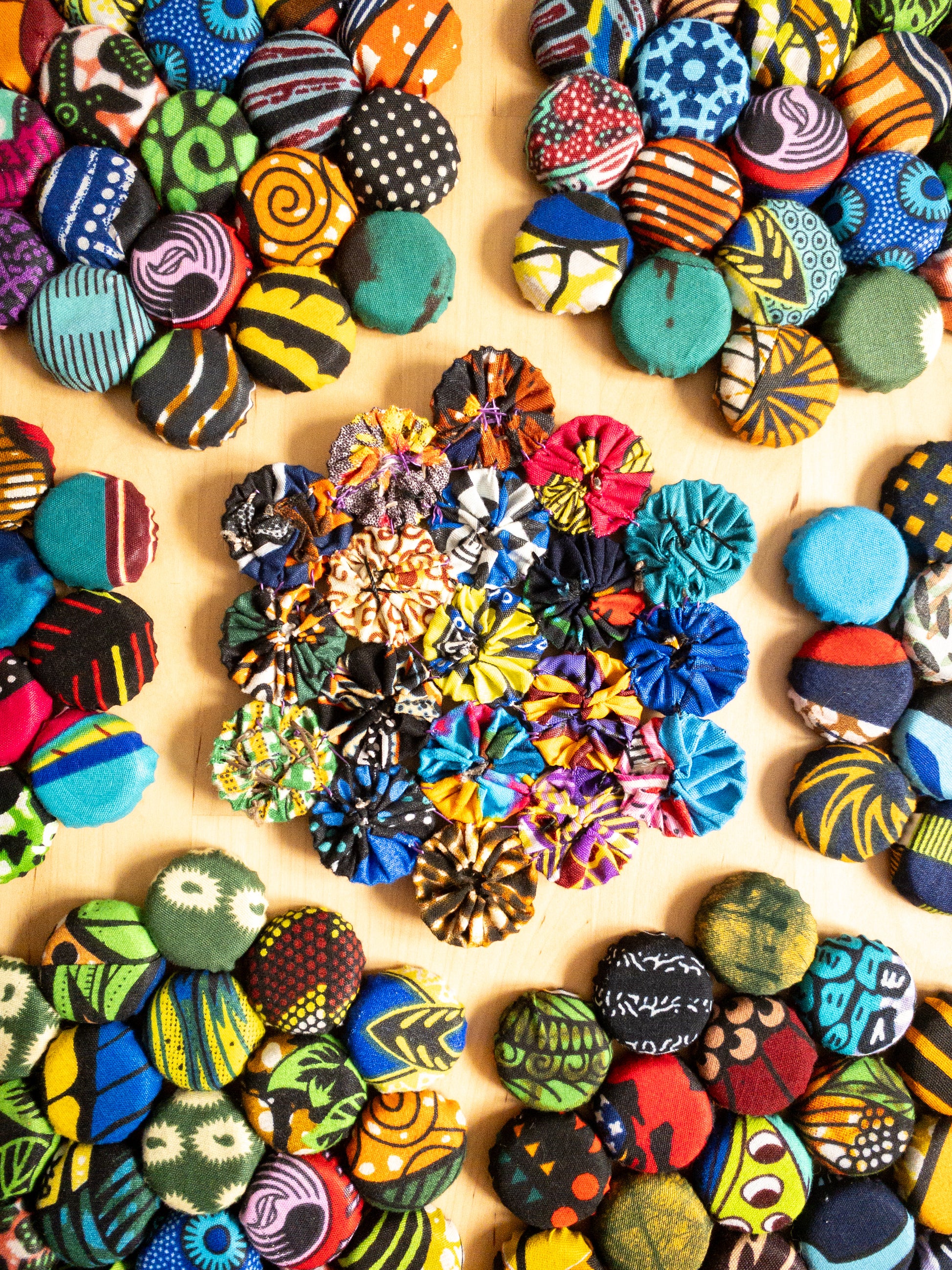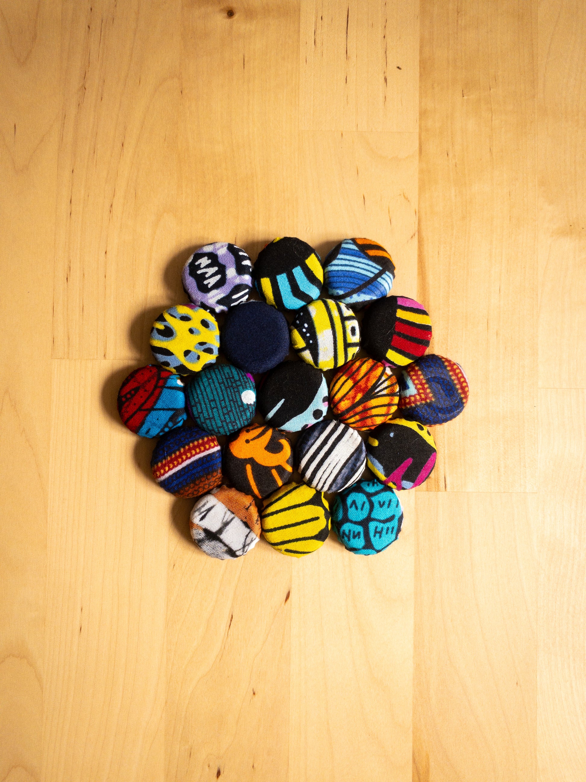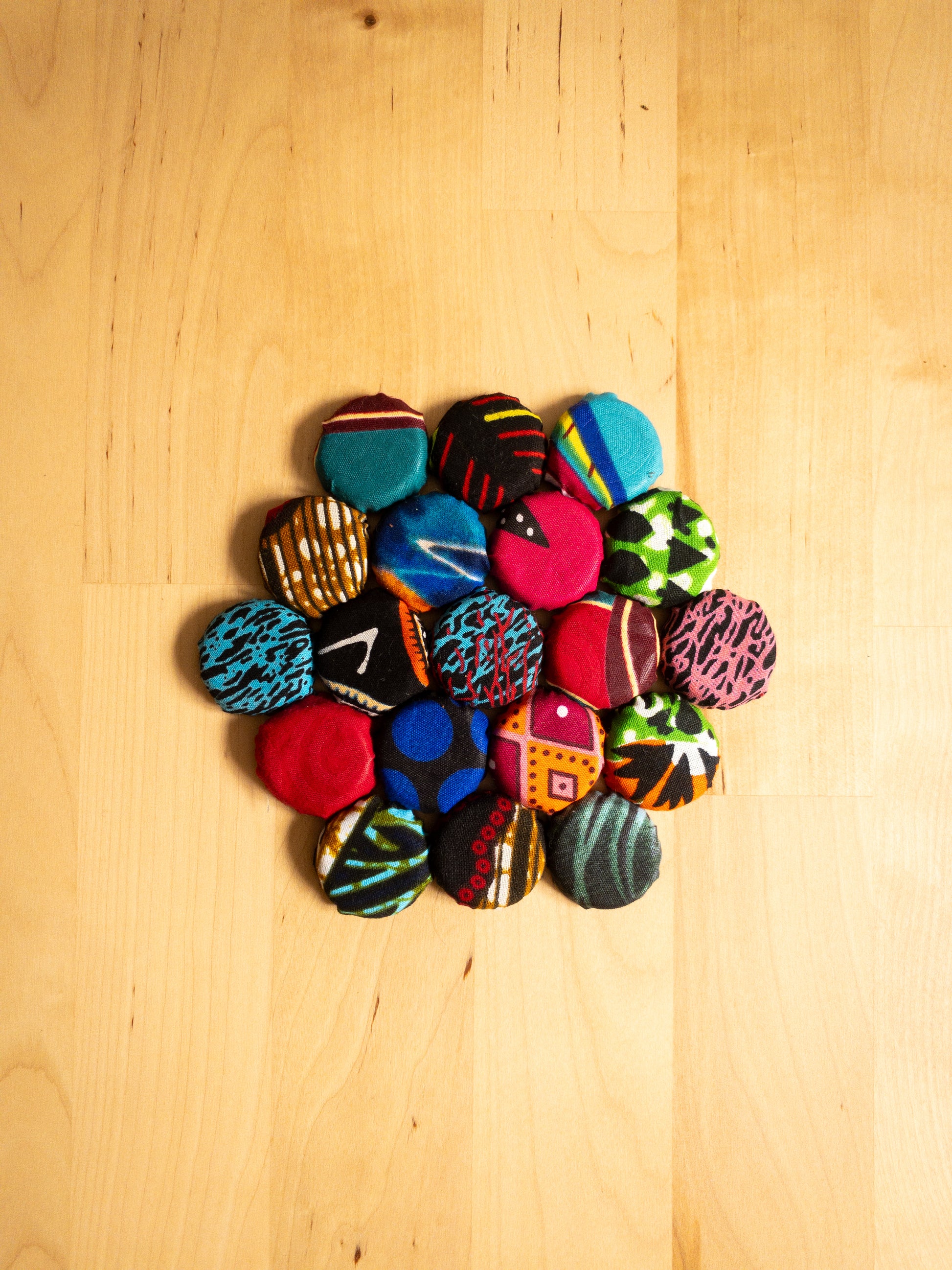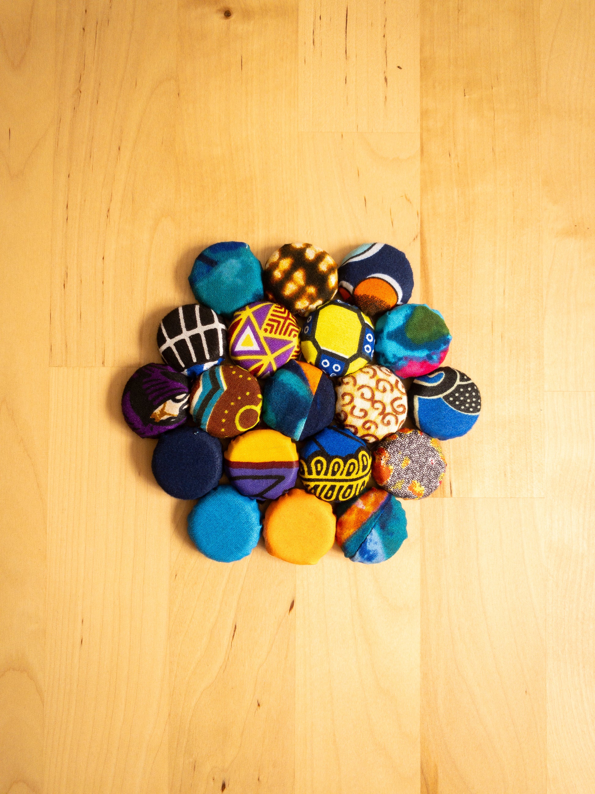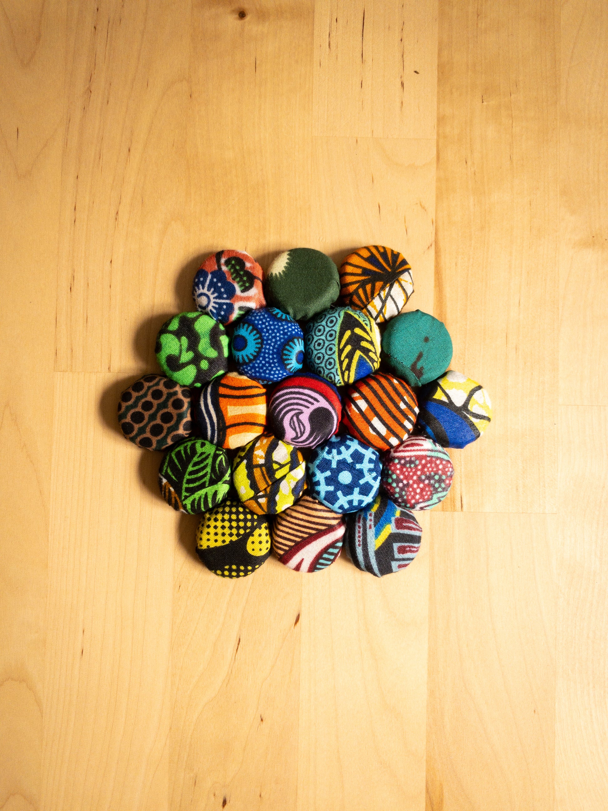 Bring a splash of colour to your home with these bright, bold Bottle Top Mats! Crafted from recycled bottle tops and scrap fabric, they’re perfect as coasters, hot pot mats, or quirky plant stands. Each mat supports women’s empowerment, turning everyday items into joyful statements of sustainability and style. Handmade and using bright kitenge each piece is a one of a kind collage of patterns that will surely bring a pop of colour to your home.