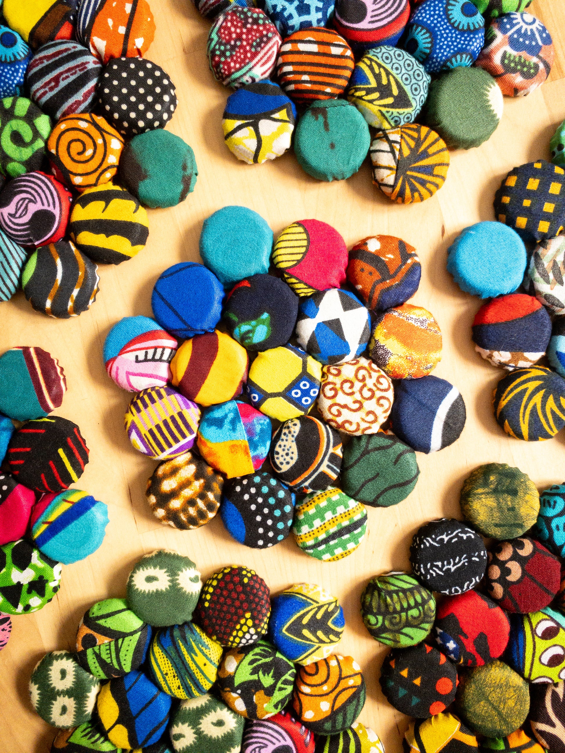 Created using recycled bottle tops collected from the SEW Community Cafe and local eateries. The ladies then collect scrap kitenge from their own cut offs and the tailors yard in Lira and use them to cover the bottle tops, binding them together with fishing wire for durability.