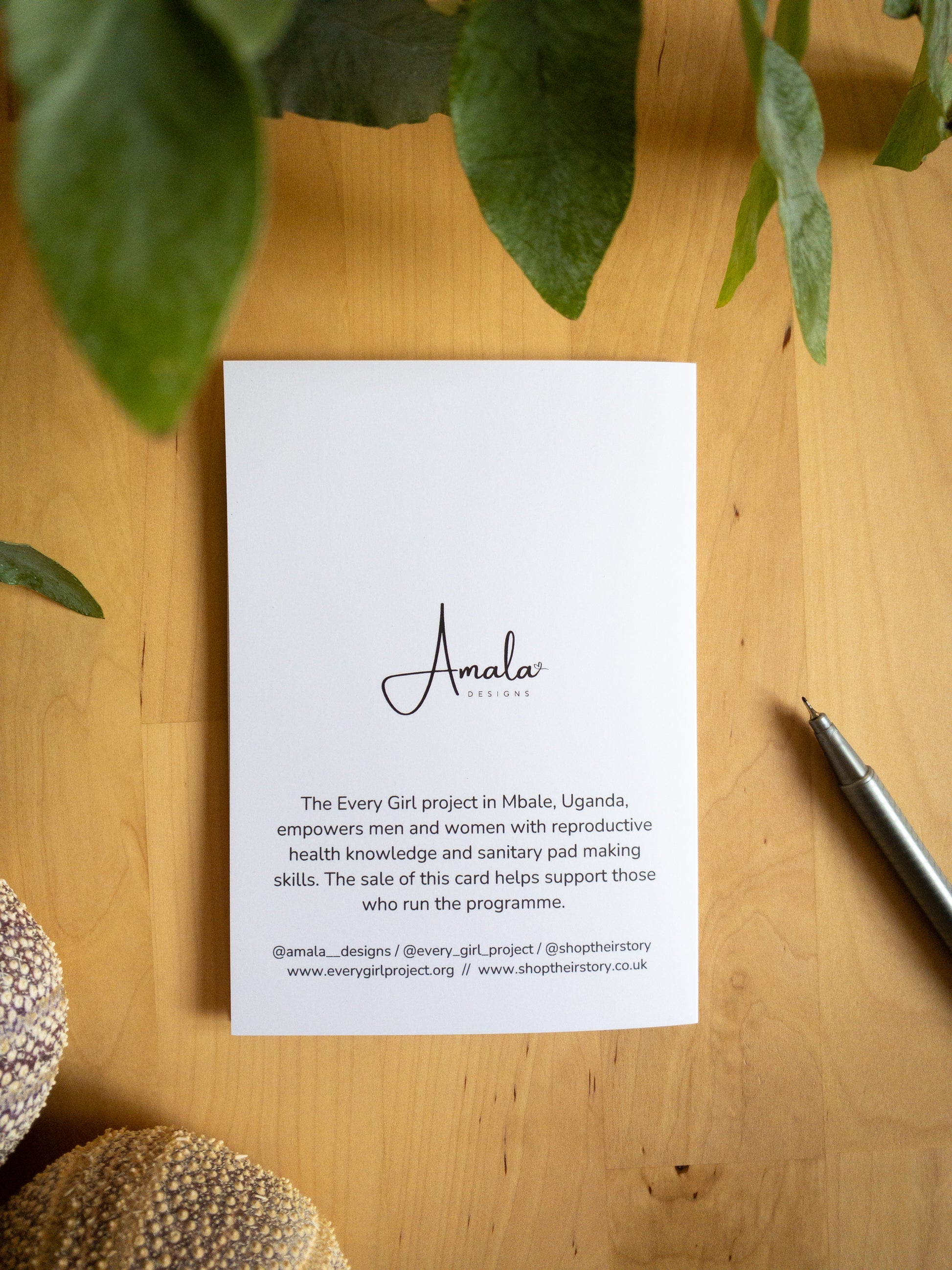 The Every Girl project in Mbale, Uganda, empowers men and women with reproductive health knowledge and sanitary pad making skills. The sale of this card helps support those who run the programme.