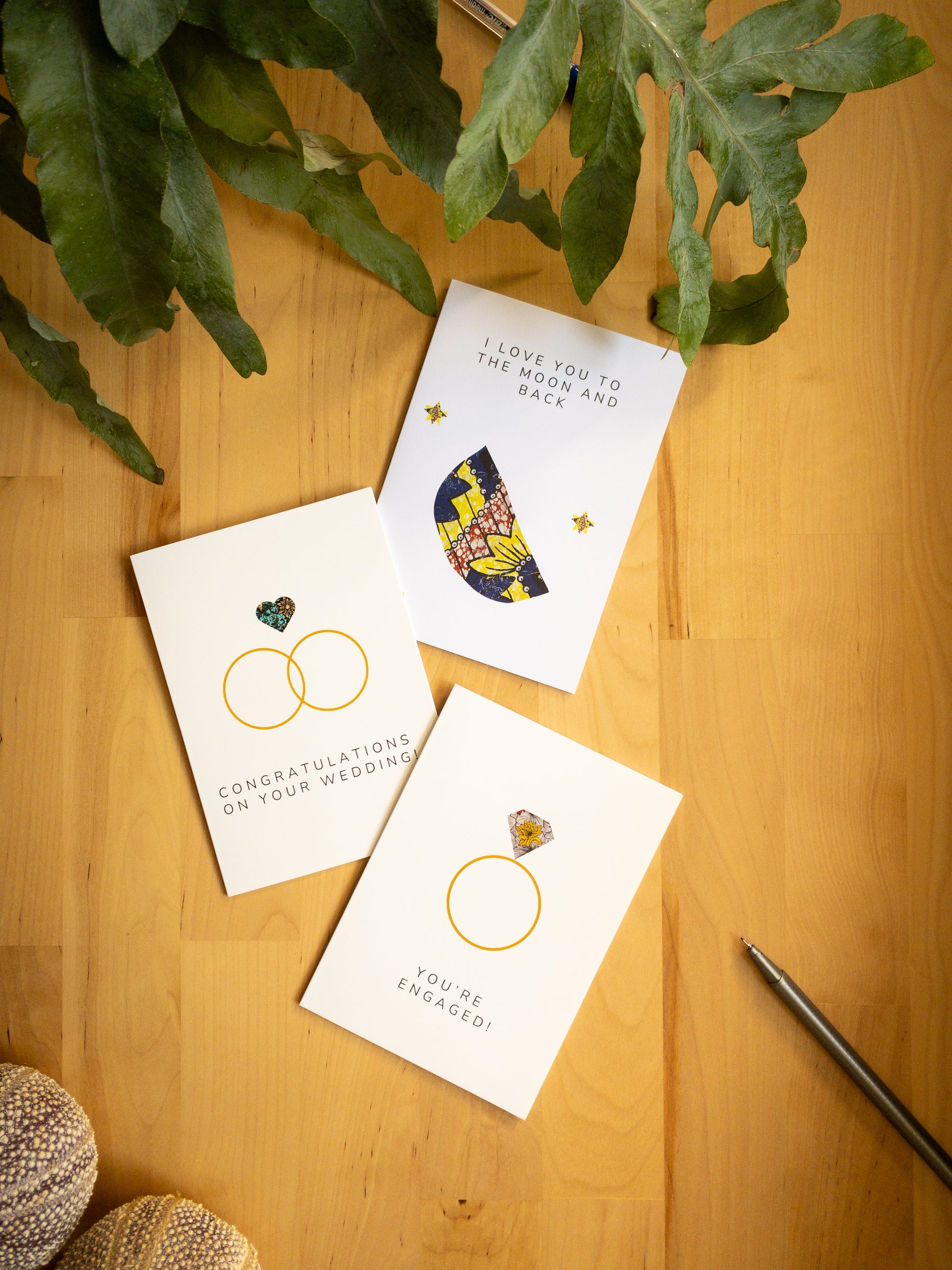Featuring brightly coloured, digitalised kitenge fabric, these cards celebrate the rich beauty of traditional African textiles.